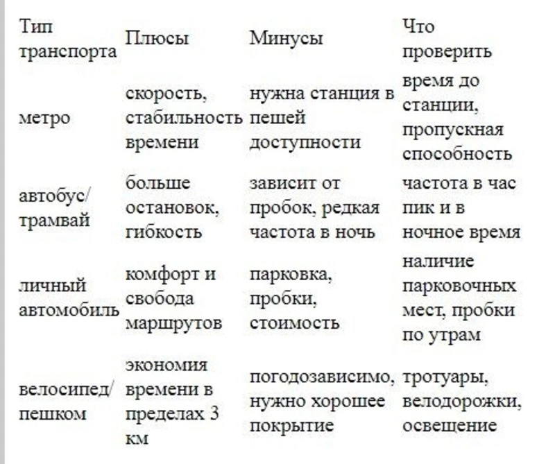Сравнительная таблица видов транспорта и их влияние на выбор района