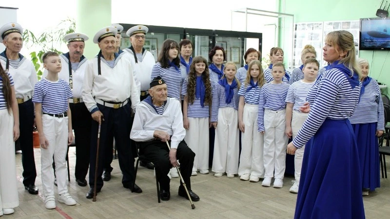 Юнармейцы, студенты и артисты хоров «Живая память» и «Бомбини» (руководитель Оксана Загороднева) пришли поздравить человека, который в 16 лет добровольцем ушёл на фронт и бороздил воды Тихого океана на легендарной «Щуке».